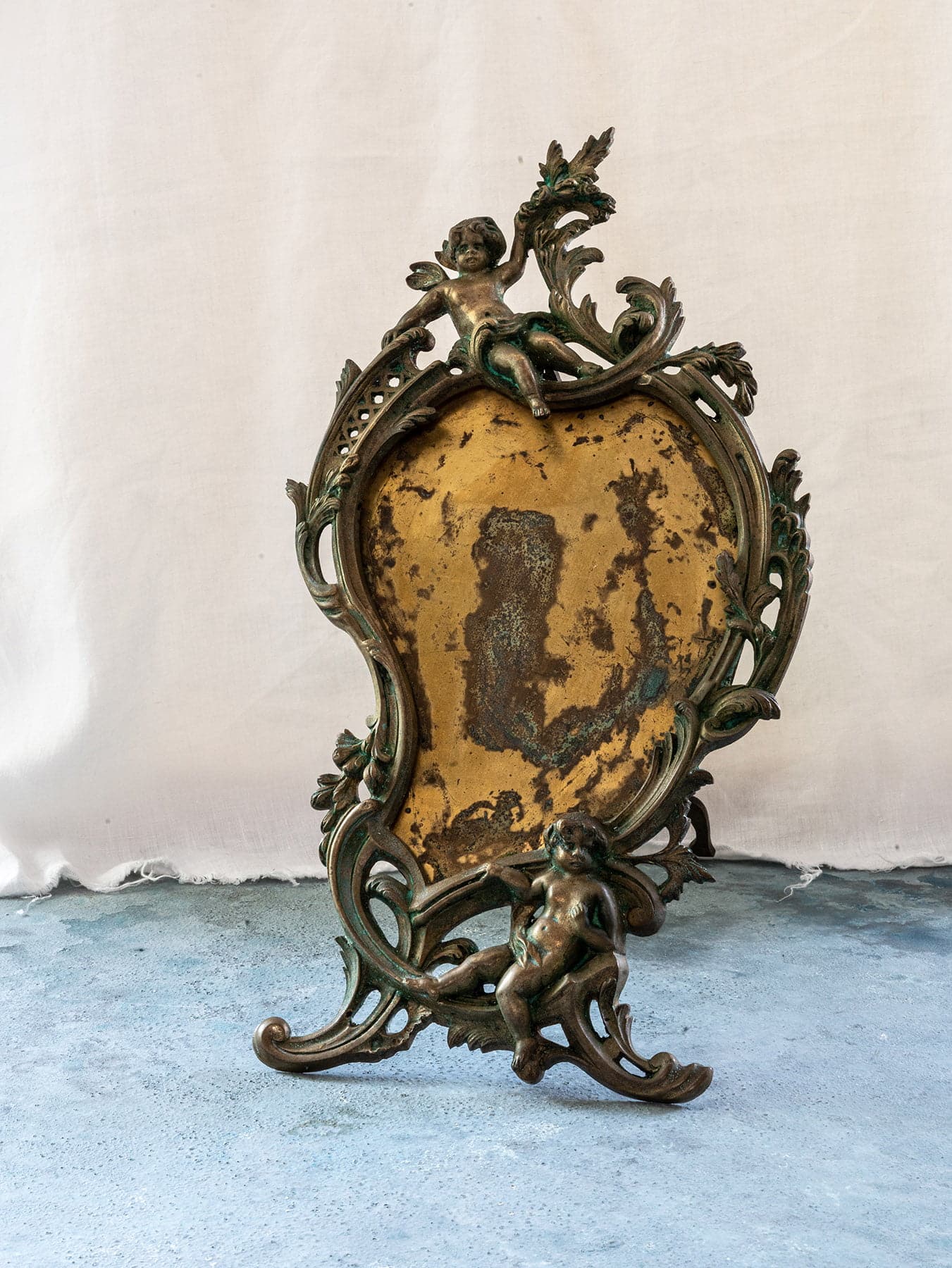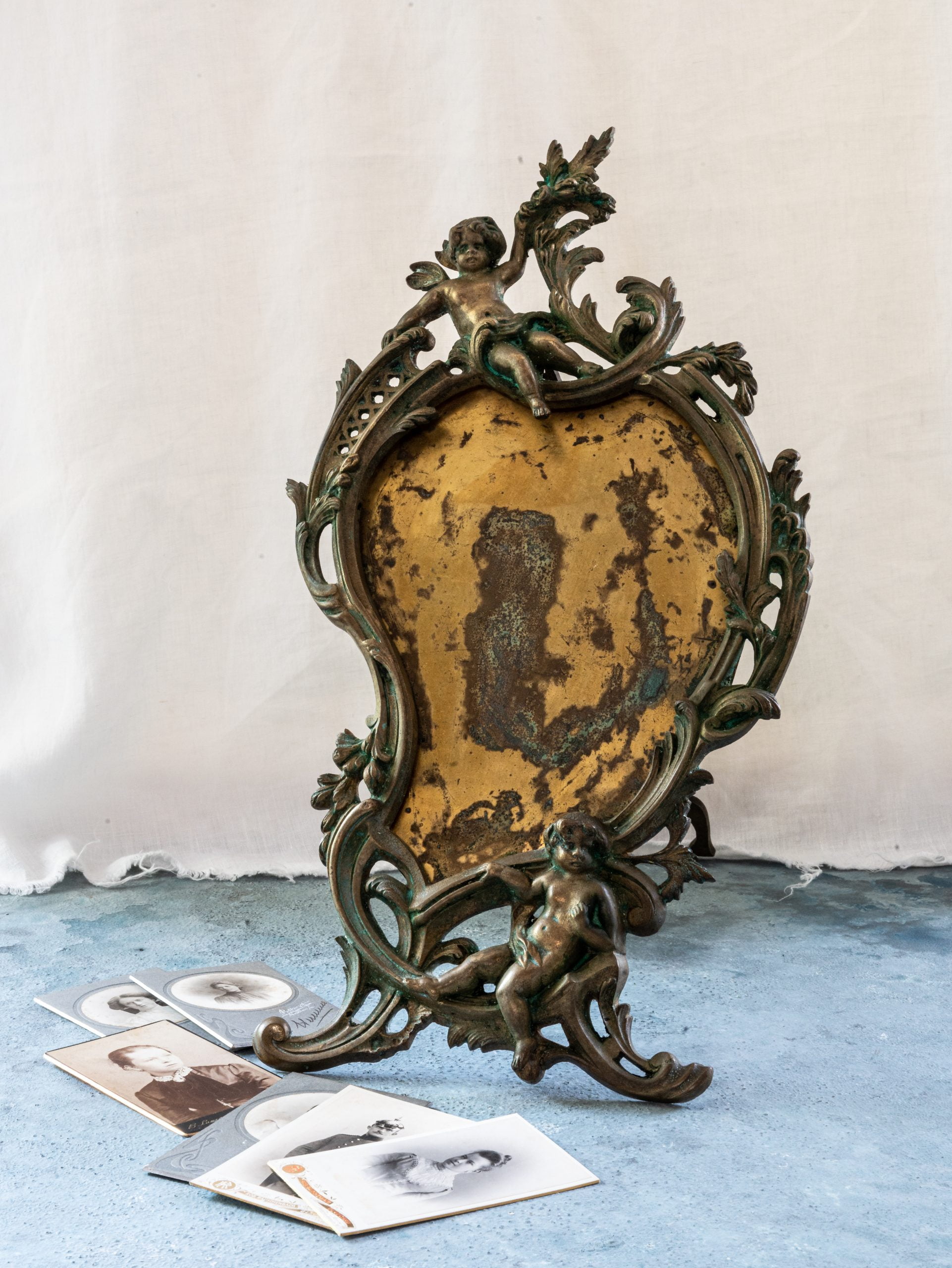 En az 150 yaşında olduğunu tahmin ettiğimiz, üzerindeki figürlere bayıldığımız, döküm Fransız üretimi masa aynası. Aynası zaman içinde kırılıp düşümüş, yeni bir ayna ile veya fotoğraf çerçevesi olarak kullanılabilecek özel, zarif bir parça.