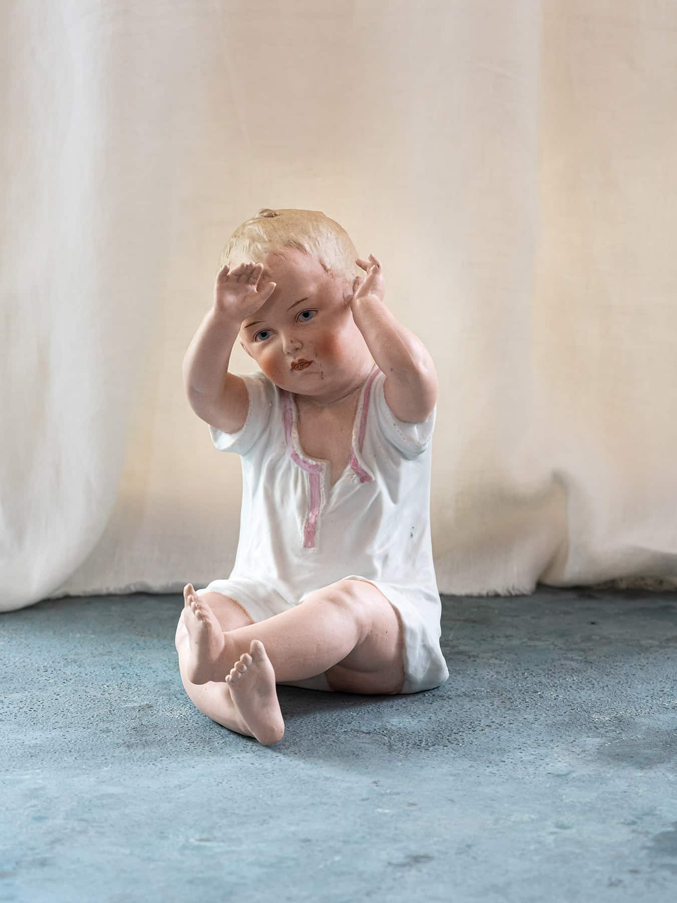 Yaklaşık 80 yaşlarında, bir zamanlar kim bilir hangi çocukların gününü şenlendirmiş, Avrupa üretimi oyuncak bebek.