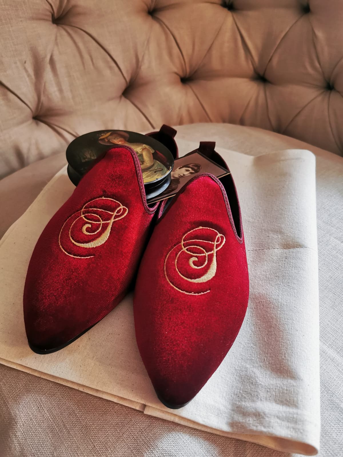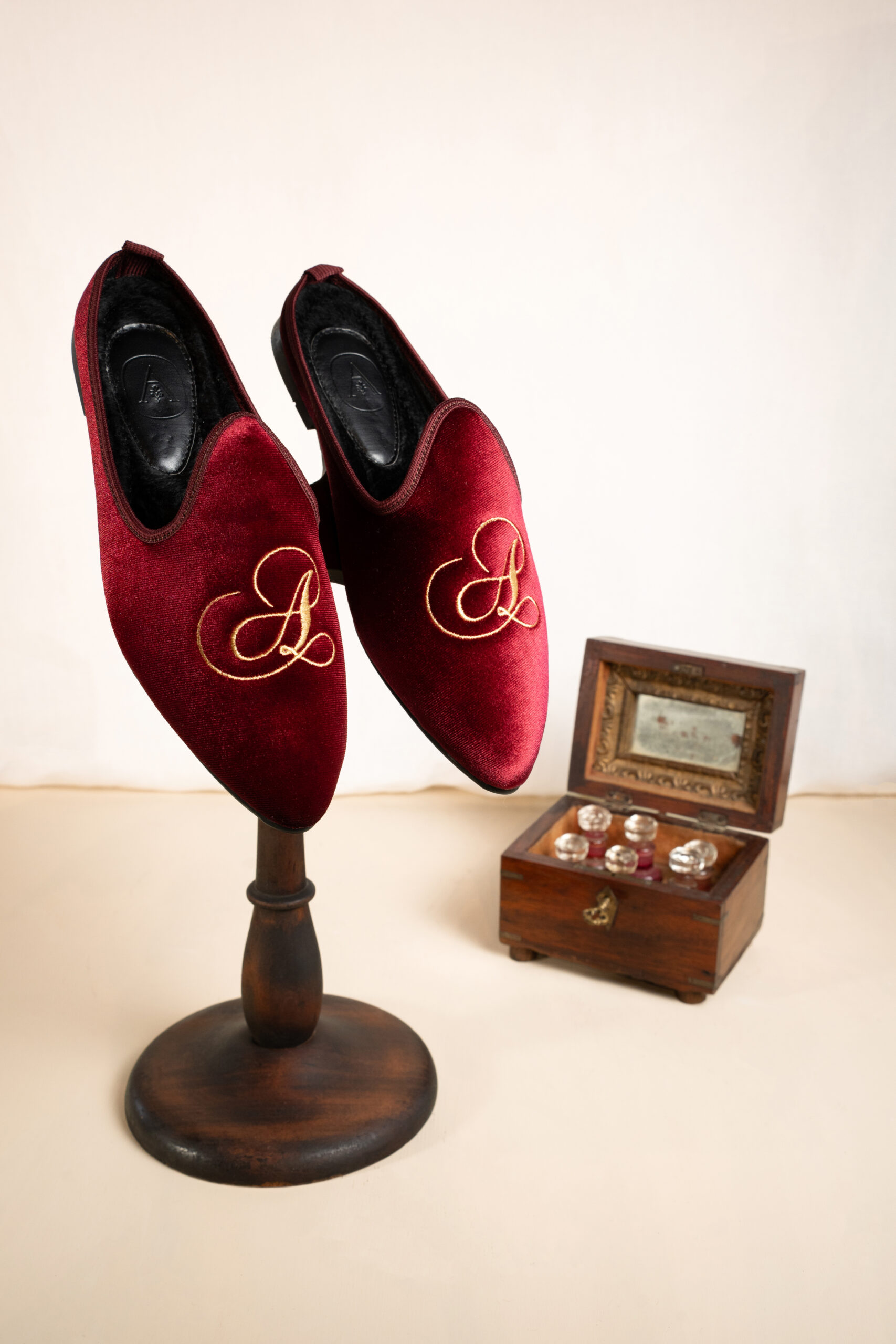 Bordo kadife kumaş babouche terlik, altın rengi harf inisiyalli, biyeli, içi kürklü terlik. %100 el yapımıdır.
