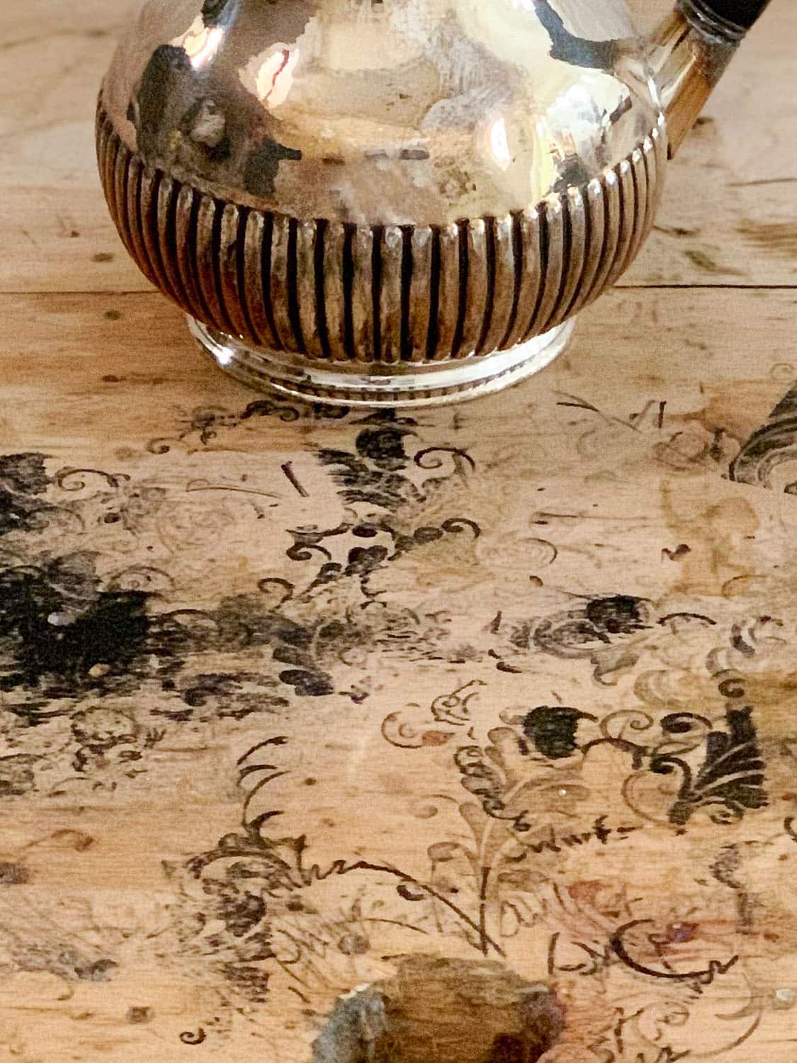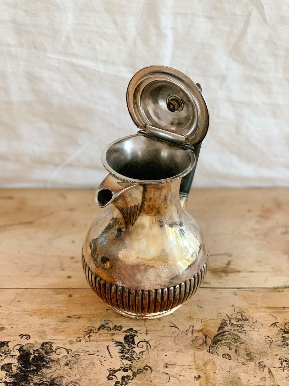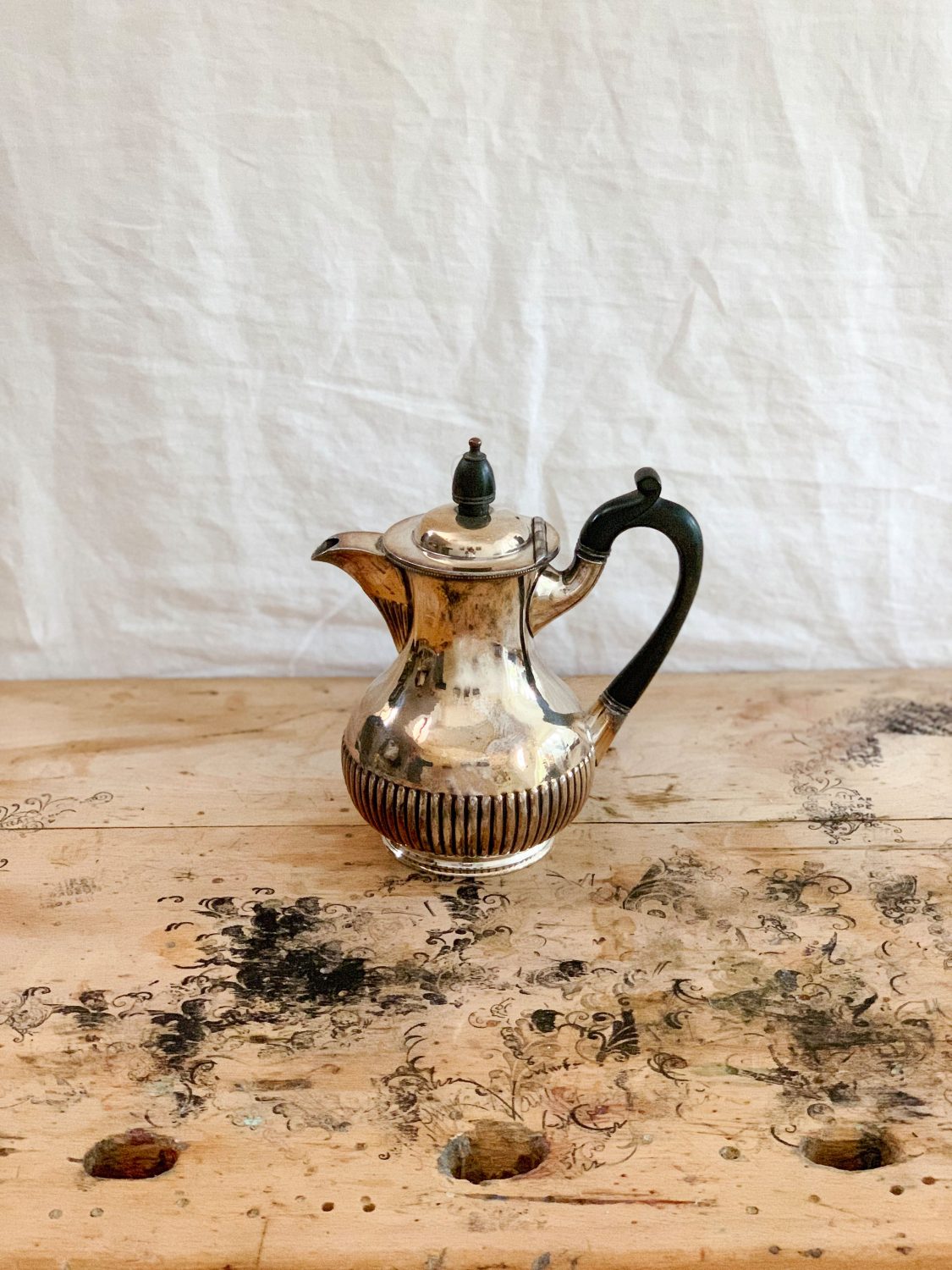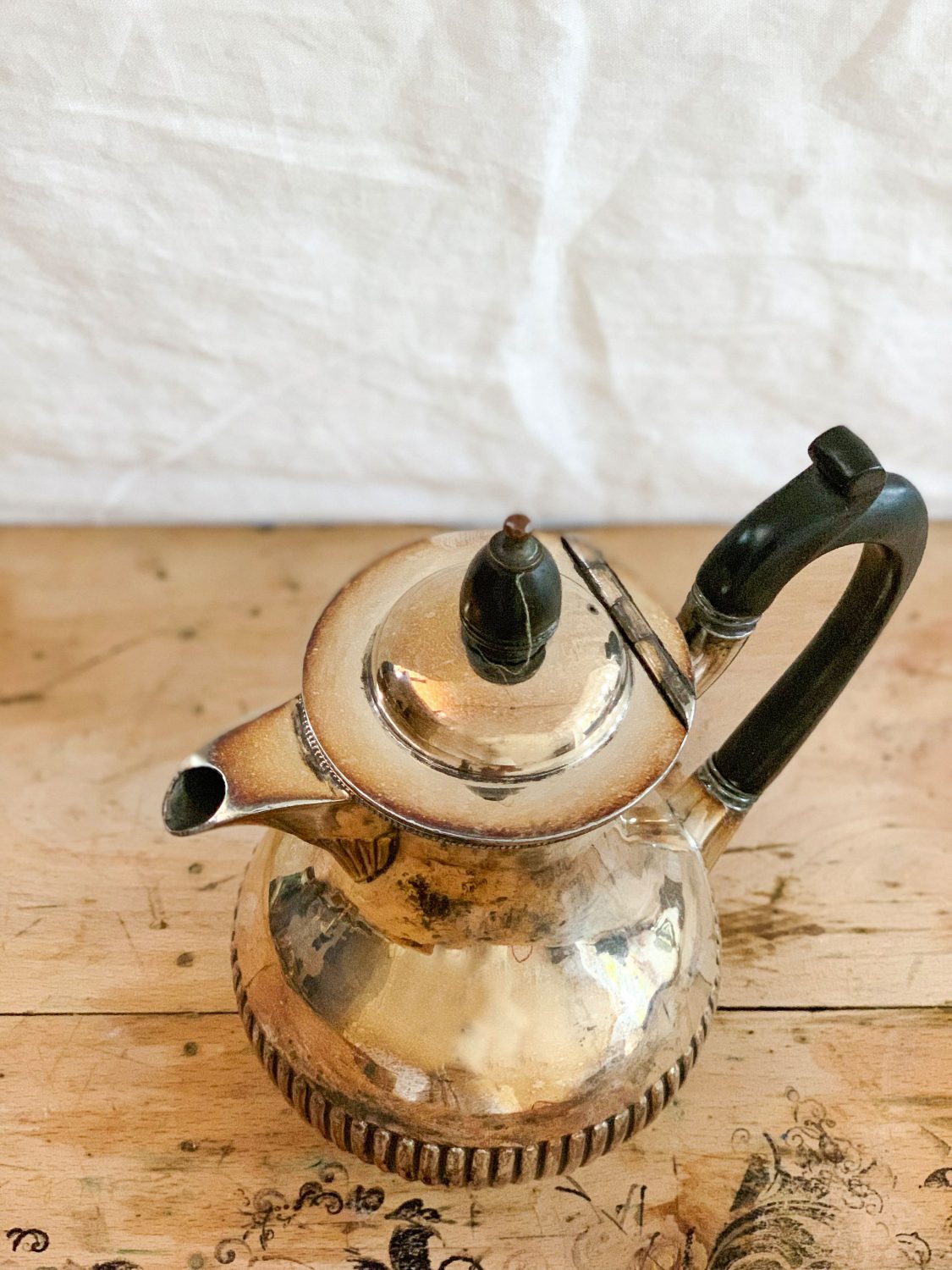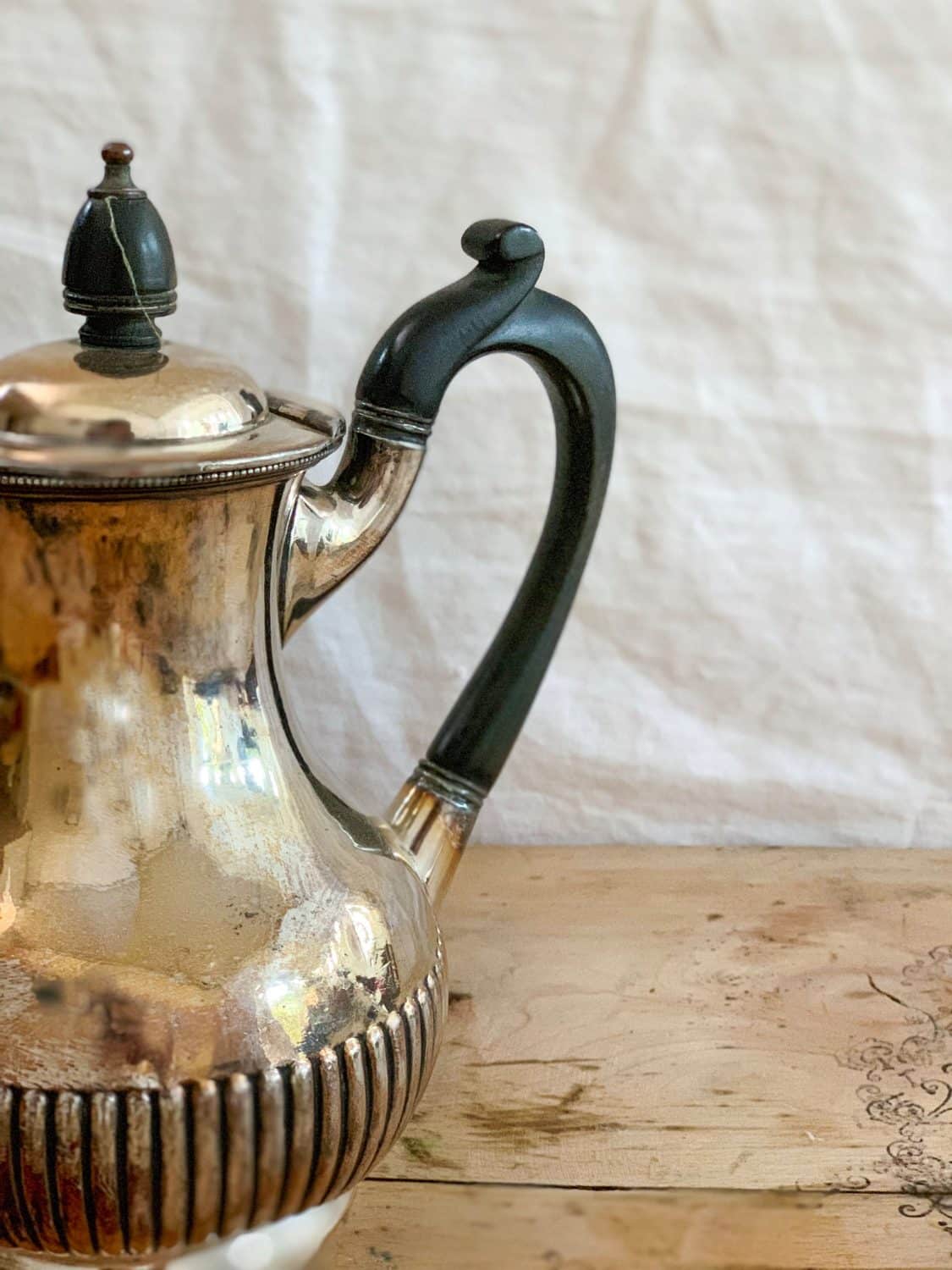 Bir çay saati hayal ediyoruz, başrolde bu demlik var. Kendisi İngiliz, dışı gümüş kaplama, içindeki bez süzgeci hala sağlam. Abanoz sapı ve olanca zarafetiye sofrada.