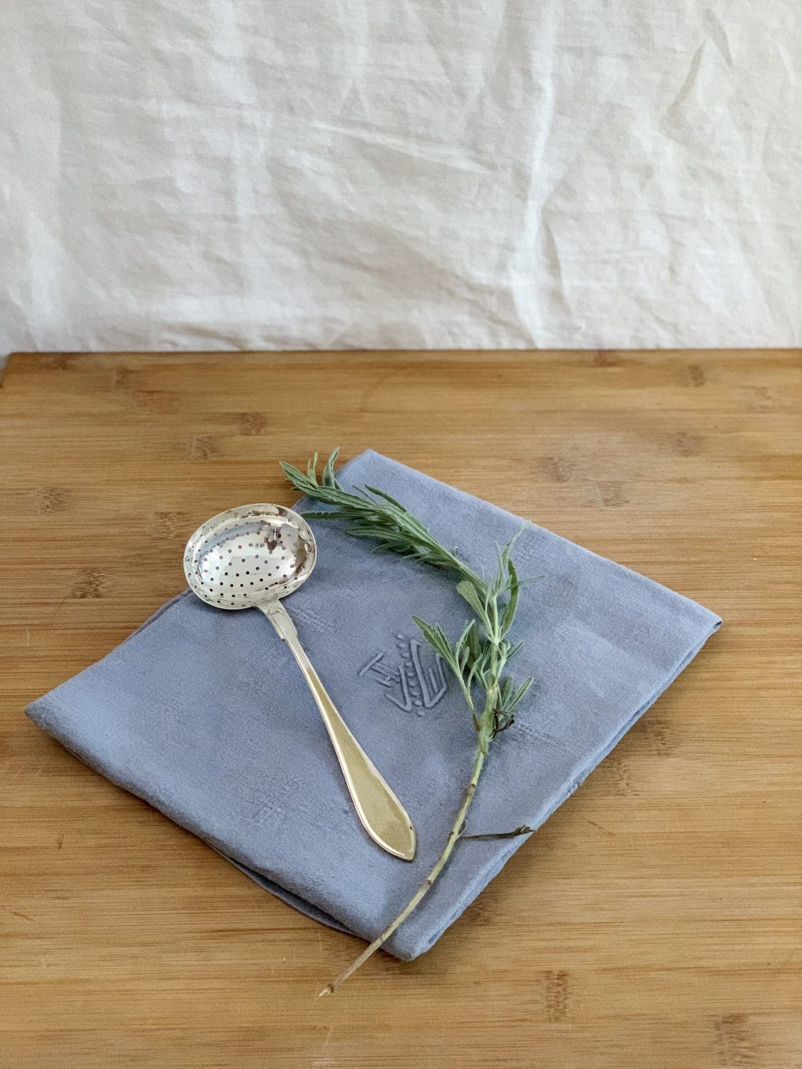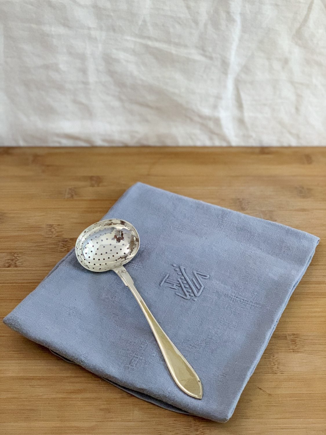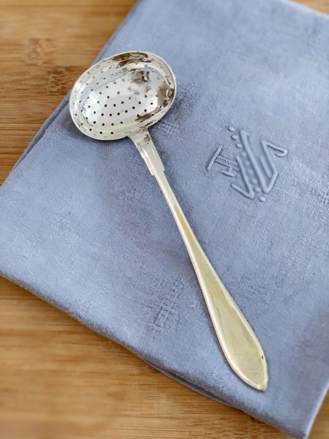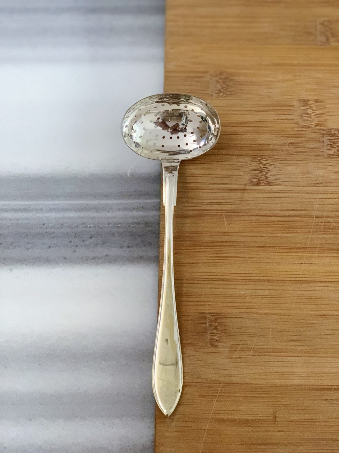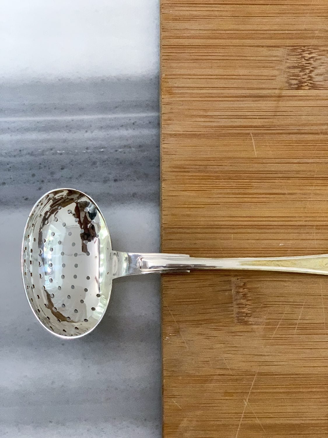 Yüzyıl başından bir gümüş kaplama kevgir. Avrupa’da bir yerlerde, soğuk bir kış gününde bir döküm ocağın üstünde bir şeyler pişiyor – kim bilir belki bir komposto? İşte bu kevgir o tencereye giriyor, çıkıyor, posayı toparlıyor. Ya da en azından bir böyle hayal ediyoruz.