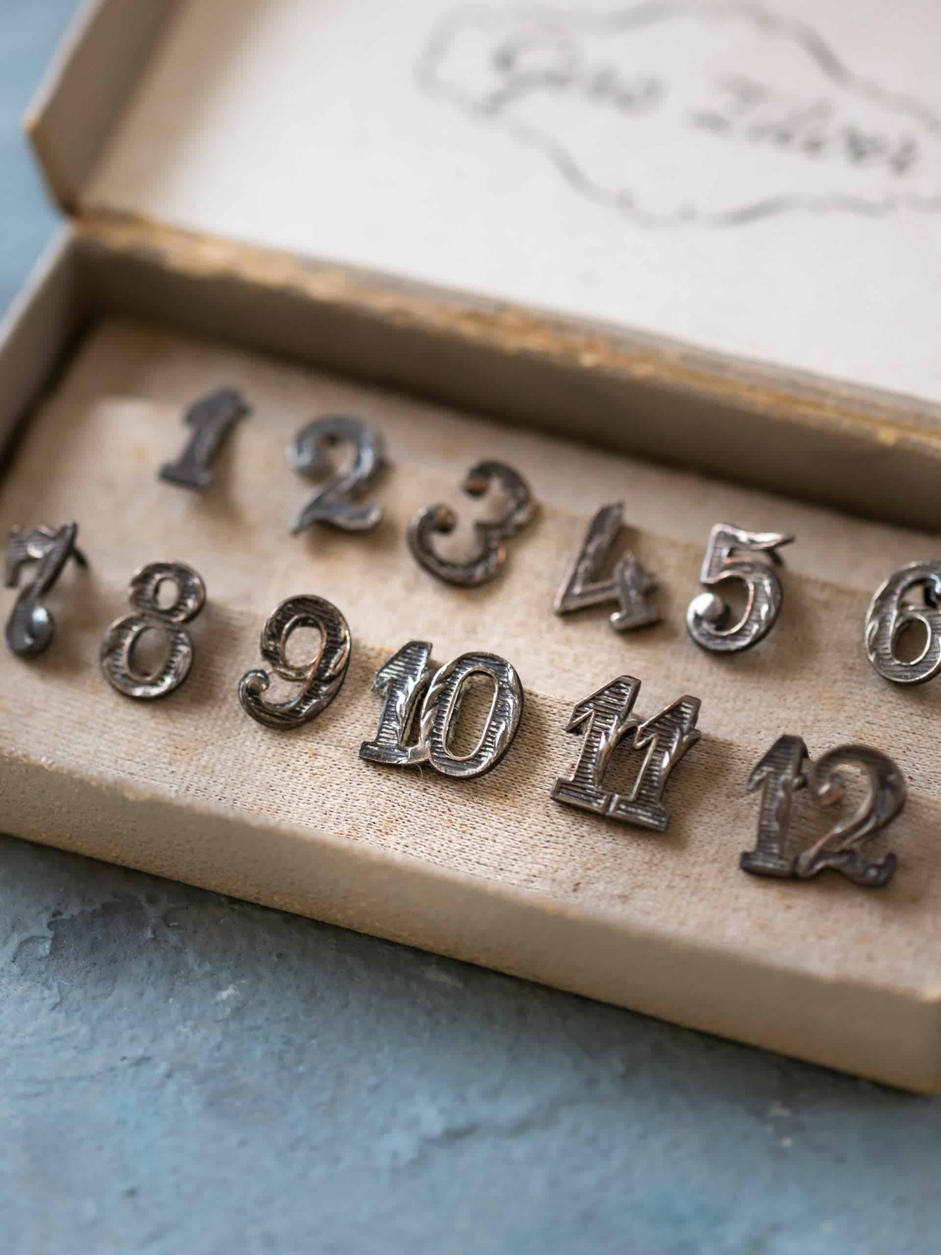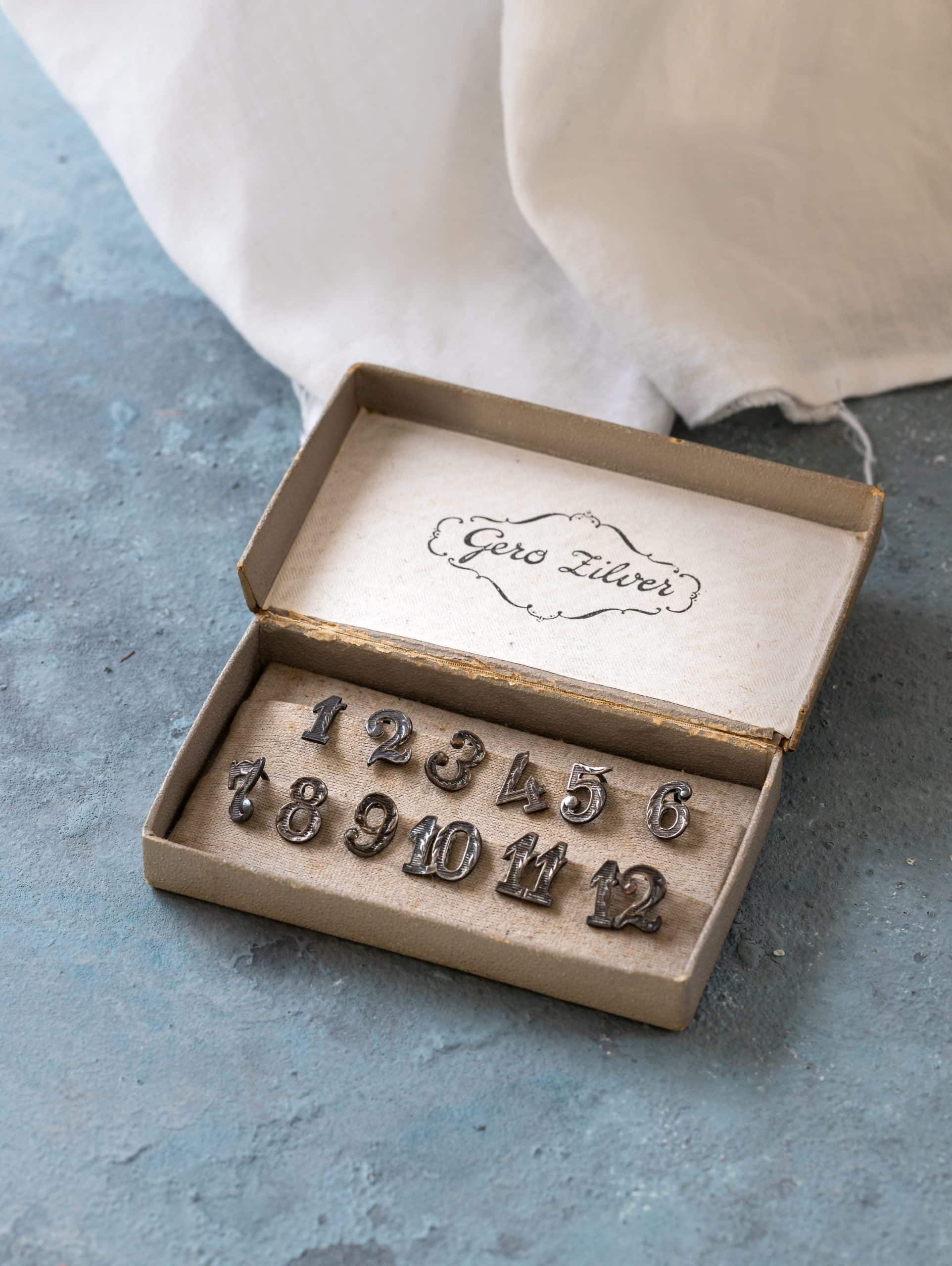 1950’lerden kalma, tamamı gümüş palto / bardak markörü. Vestiyere & bara bırakılan paltonun veya bardağın kenarına iliştirilen bu markörler, eşyanın sahibini belirlemede kullanılıyor. Hollanda üretimi.