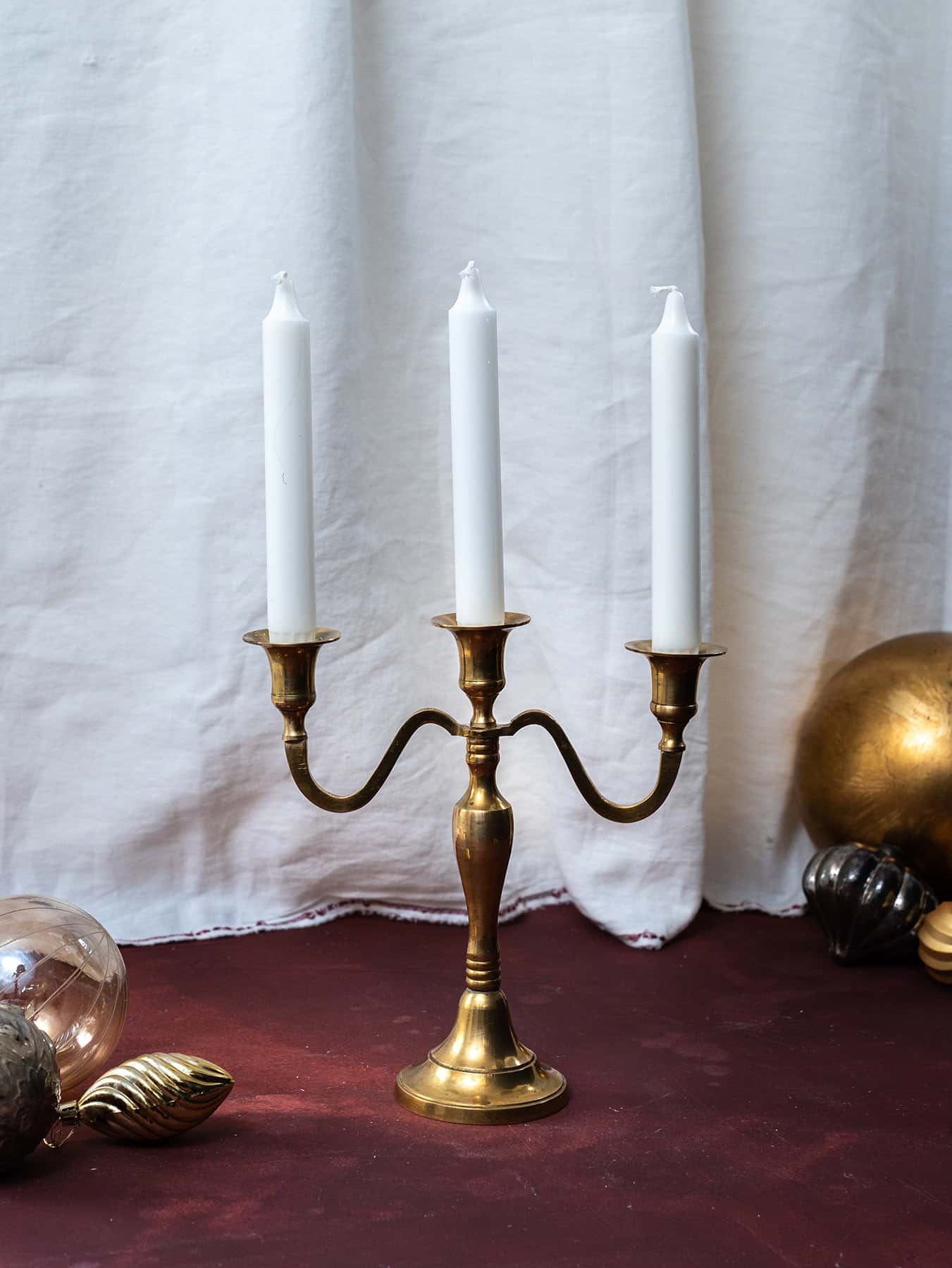 Danimarka menşeili üç kollu zarif pirinç şamdan. Yaklaşık 70 yaşında.